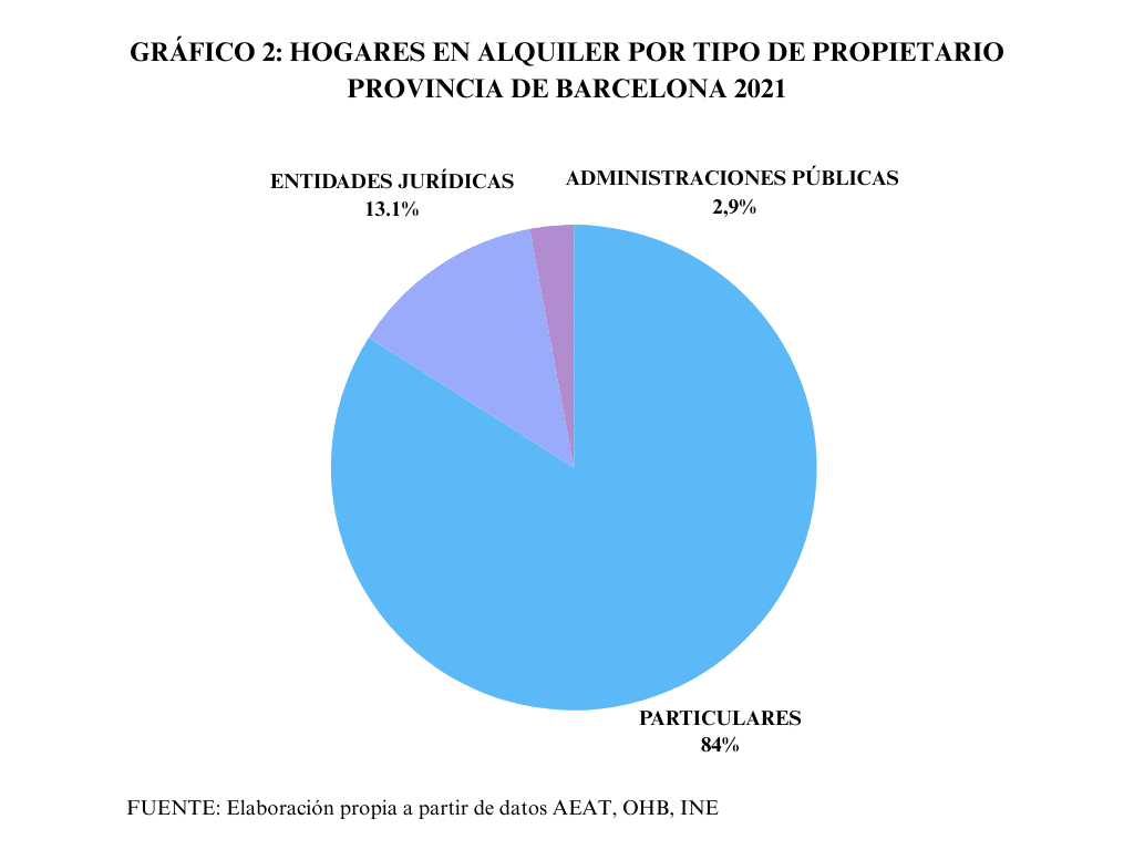 De nou la dada és clara; del total d’habitatges de lloguer, el 84% són propietat de particulars, un 2,9% pertany a administracions públiques i el restant 13,1% està en mans d’entitats jurídiques (empreses, fons d’inversió, SOCIMI, i societats limitades).