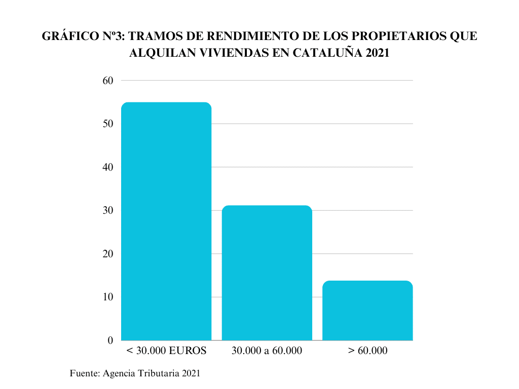Si consultem les dades de l’Agència Tributària per a tota Catalunya, obtenim una visió més completa. El 55% dels particulars que lloguen habitatges se situen en els trams de rendiment inferiors a 30.000 euros anuals. Un 31,18% es troba en el rang d’ingressos de 30.000 a 60.000 euros anuals, i un 13,8% supera els 60.000 euros anuals. Aquestes dades suggereixen que la gran majoria del mercat de lloguer està en mans de les classes mitjanes, la qual cosa reflecteix una certa solidesa i transversalitat en la tradicional societat de propietaris després de la crisi.