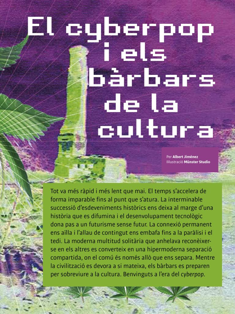 Tot va més ràpid i més lent que mai. El temps s’accelera de forma imparable fins al punt que s’atura. La interminable successió d’esdeveniments històrics ens deixa al marge d’una història que es difumina i el desenvolupament tecnològic dona pas a un futurisme sense futur. La connexió permanent ens aïlla i l’allau de contingut ens embafa fins a la paràlisi i el tedi. La moderna multitud solitària que anhelava reconèixer-se en els altres es converteix en una hipermoderna separació compartida, on el comú és només allò que ens separa. Mentre la civilització es devora a si mateixa, els bàrbars es preparen per sobreviure a la cultura. Benvinguts a l’era del cyberpop.