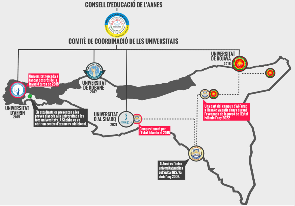 L’any 2022-2023, 2.974 estudiants van assistir a les universitats de l’AANES. El sistema universitari del NES s’enorgulleix del fet d’oferir educació gratuïta. L’alumnat de les tres universitats del territori no paguen cap quota i les que provenen d’alguna de les àrees ocupades per Turquia – Afrin, Sere Kaniye o Tel Abyad – poden rebre ajuda econòmica.